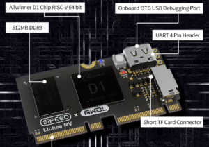 Powered by a D1s (a 1 GHz D1 chip with a C906 core, a RISC-V architecture, and 64 MB of storage)