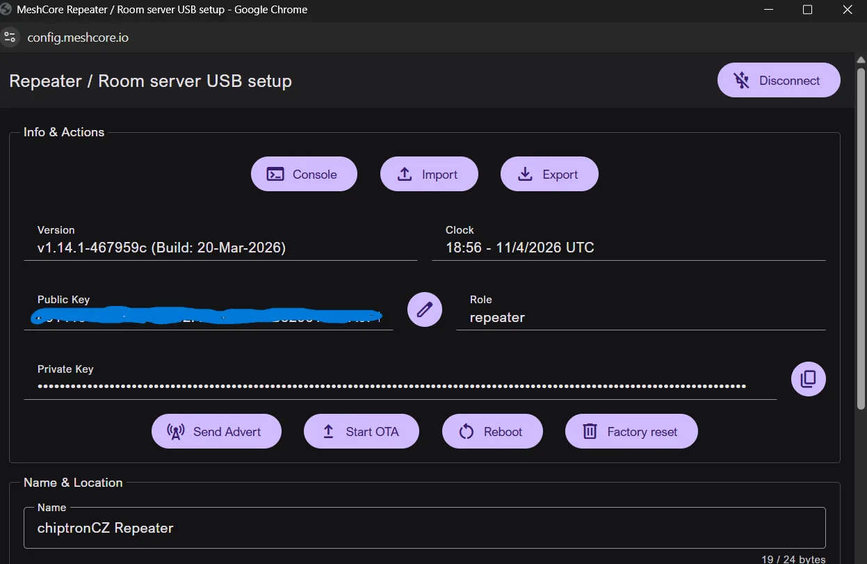 Za review článku a oprav děkuji Rastislavovi z telegramové skupiny MeshCore, který mi zároveň zaslal screenshoty z mobilní aplikace.