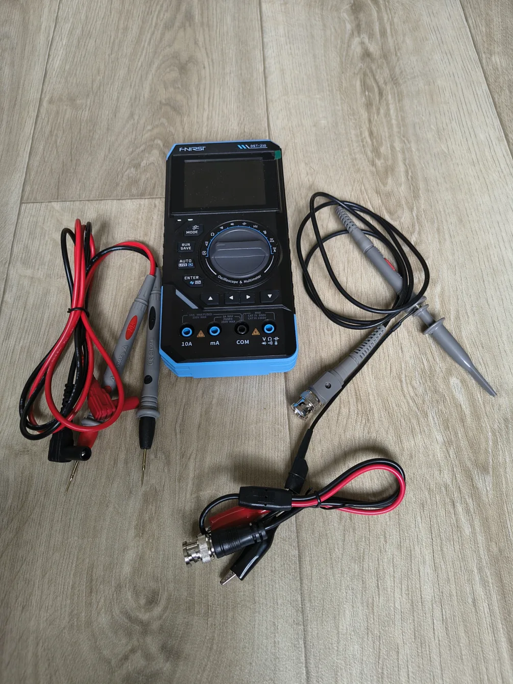 - osciloskop se vzorkovací frekvencí až 48 Msps, analogovou šířkou pásma až 10 MHz, 1MR vstupní impedancí, přepínatelnou sondou 1x a 10x, citlivostí 10mV až 10V na dílek, nastavitelný trigger (auto, manual, single), časovou základnou od 50ns do 20s a automatickým měřením – minimum, maximum, průměr, peak-to-peak, frekvence, perioda nebo duty-cycle