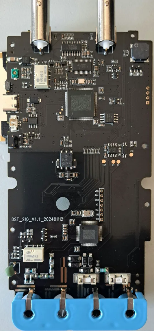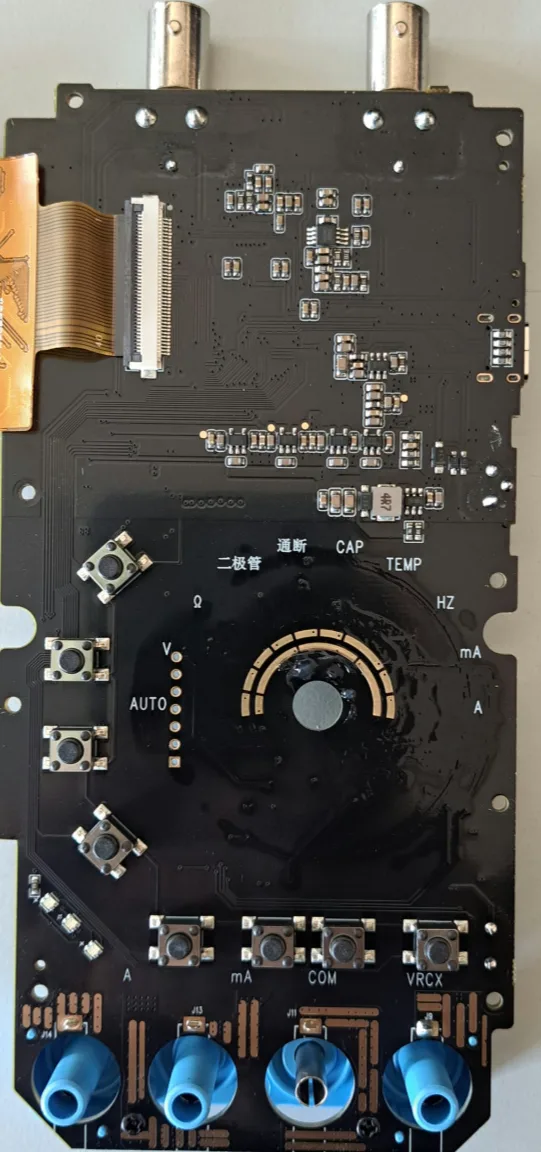 Ovládací tlačítka i otočný přepínač jsou přímo spojená s osciloskopickou částí a je to na PCB tak promíchané s multimetrovou částí, že i když to není přímo spojené, izolaci na 1 kV tomu ani trochu nevěřím.