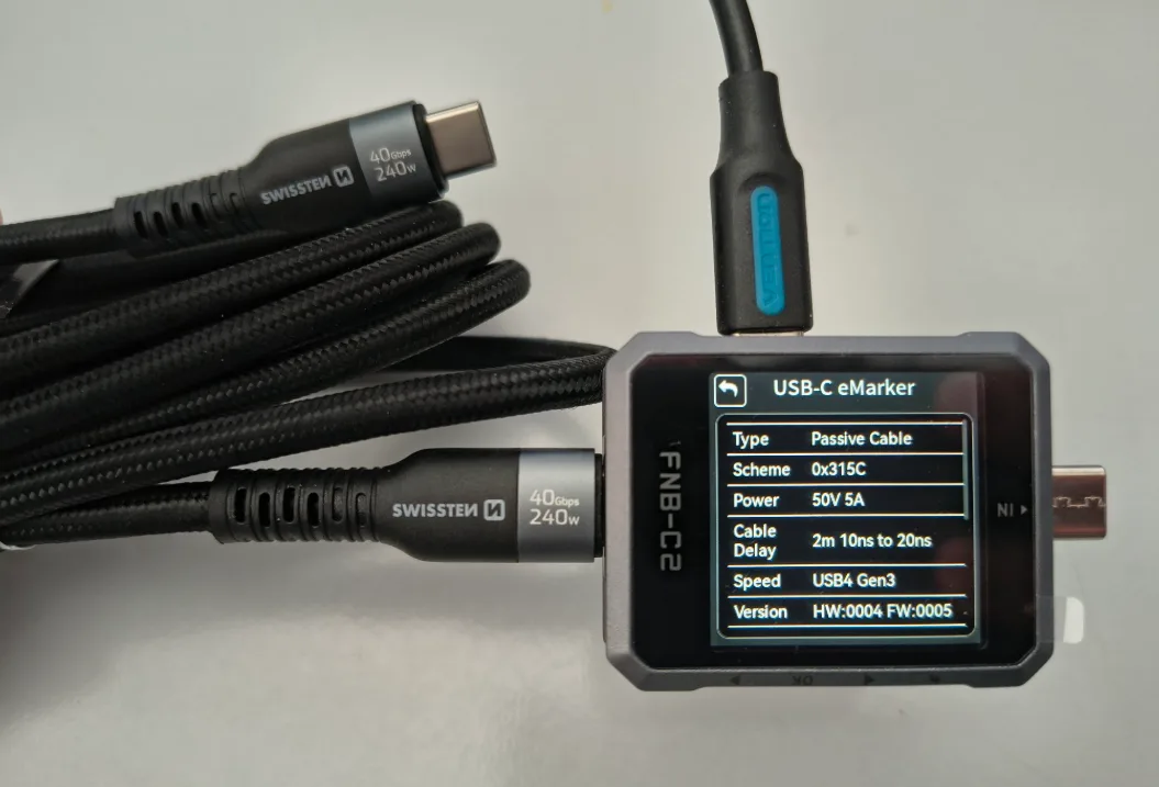 FNB-C2 dokáže identifikovat e-Marker v USB-C kabelu. Snadno si ověříte jestli kabel opravdu zvládne přenést slibovaný výkon. USB tester se tak může chovat jako kabel s e-Marker čipem či bez něj