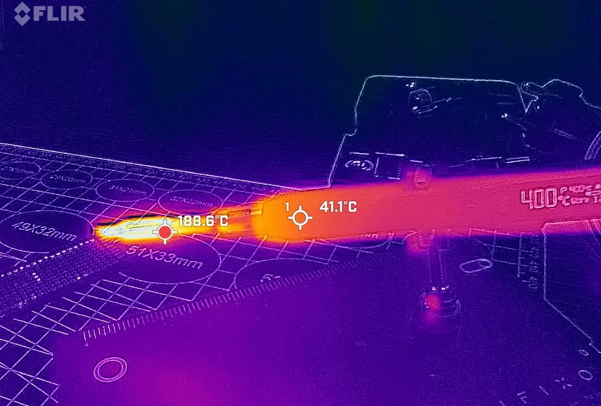 Tato není výjimkou, ale naštěstí se tělo nezahřívá nějak extrémně hodně a teplota se zastaví kolem 43 stupňů. Dále mě nepotěšilo, že nepasuje „kov na kov“ do stojánku na JBC ručky. Výměnné hroty jsou super, ale bez patřičného stojánku tuto velkou výhodu plně nevyužijete.