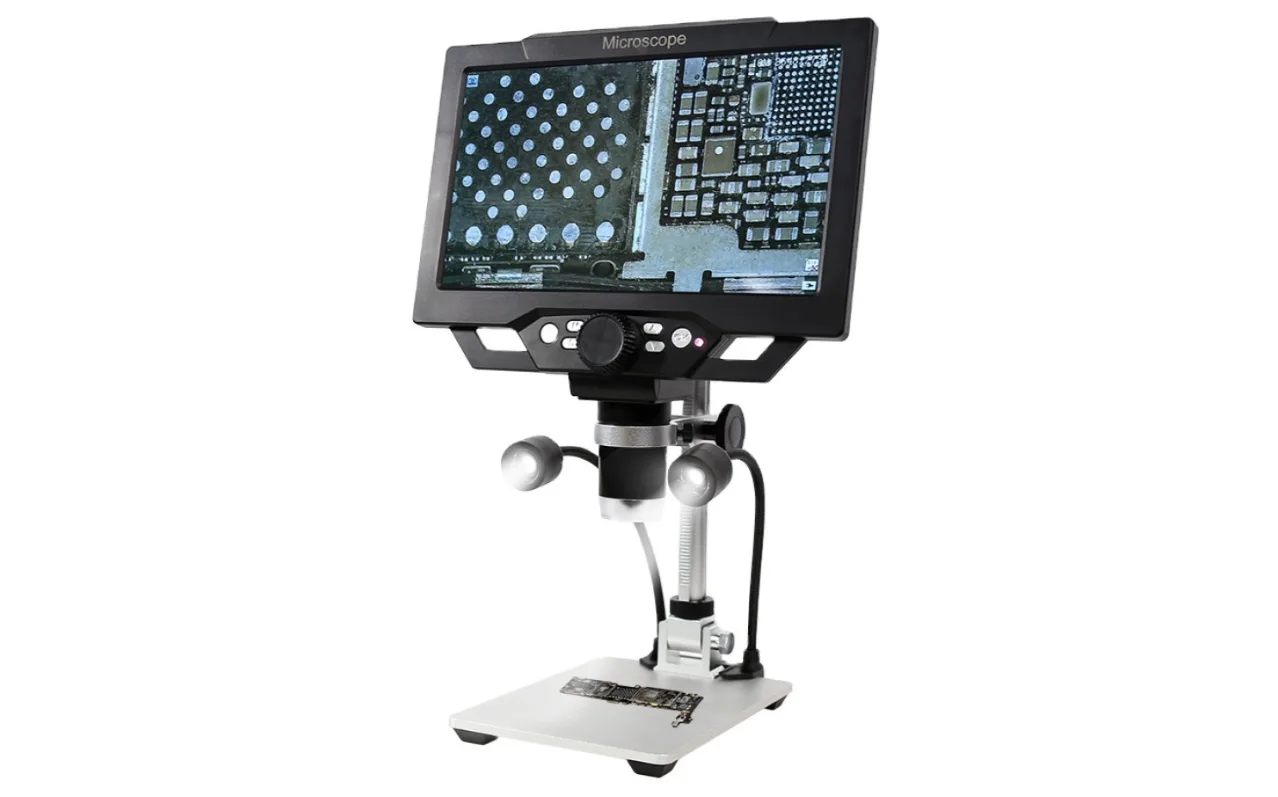 Oči už nejsou co bývaly? Mikroskop se hodí do každé dílny. Tento mikroskop s přísvitem vypadá zajímavě. Zvětšení od 10x do 1600x, rozlišení 12 MPx (1080p) a realtime obraz je přenášen na 9″ displej. Mikroskop má i vlastní vestavěnou baterii.