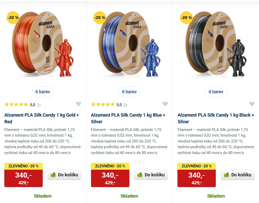 Kromě klasických barev jsou ve slevě i dvou čí tříbarevné filamenty značky Alzament https://www.alza.cz/